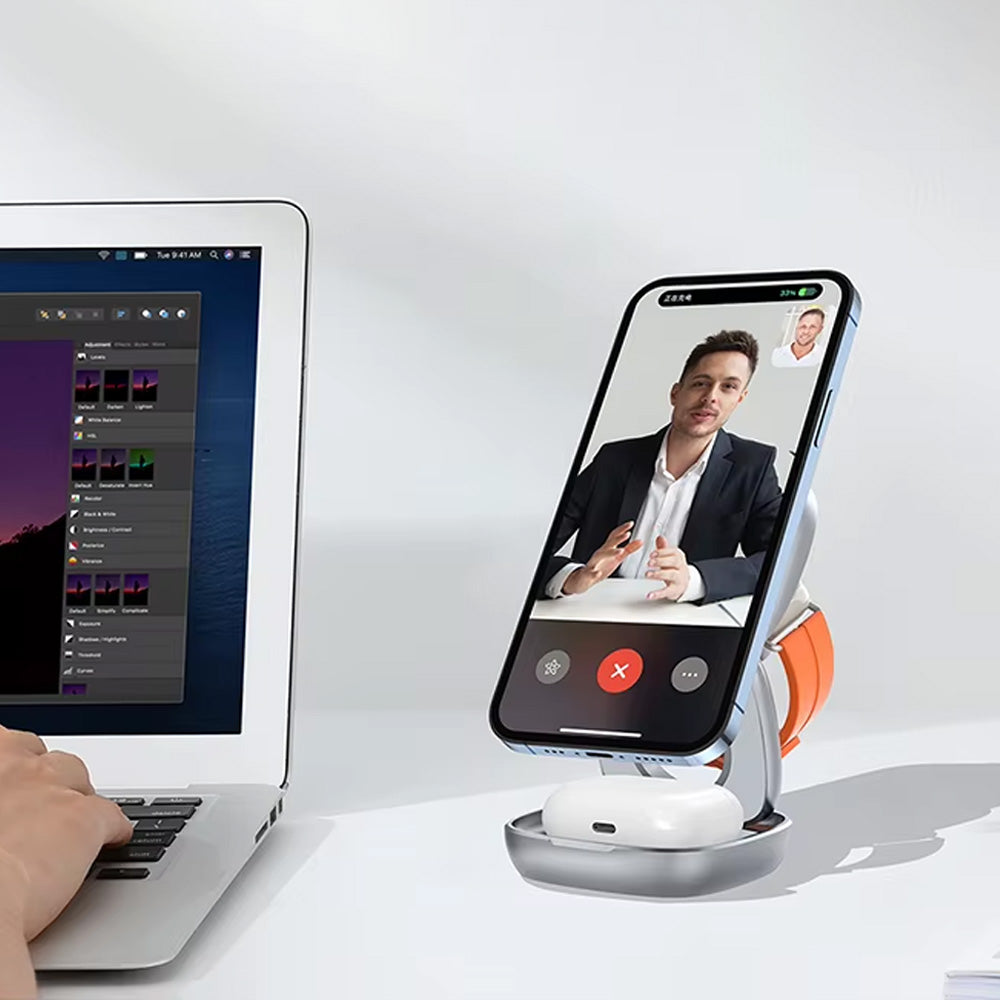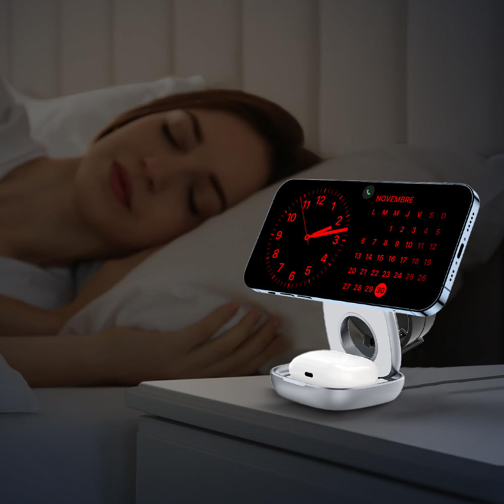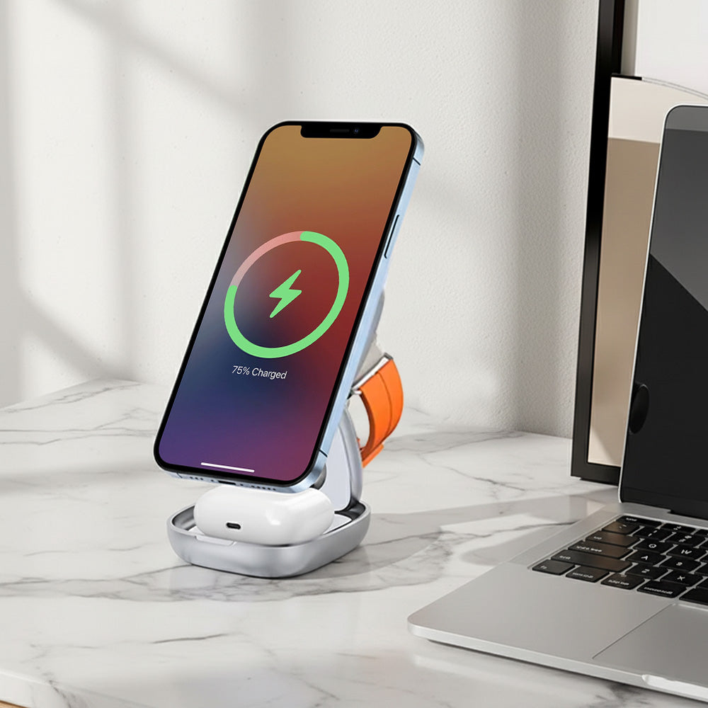 • Meet the Pivot Pod 3-in-1 MagSafe Charger, the ultimate all-in-one power solution for your Apple ecosystem. This compact, folding station delivers fast 15W MagSafe charging for your iPhone, while simultaneously powering your Apple Watch and AirPods. Crafted from premium aluminum alloy, its sleek, minimalist design pivots and folds flat for perfect portability. Enjoy complete peace of mind with automatic power-off protection once your devices are fully charged, making it the harmonious balance between convenience and safety for your desk, bedside, or on-the-go lifestyle.