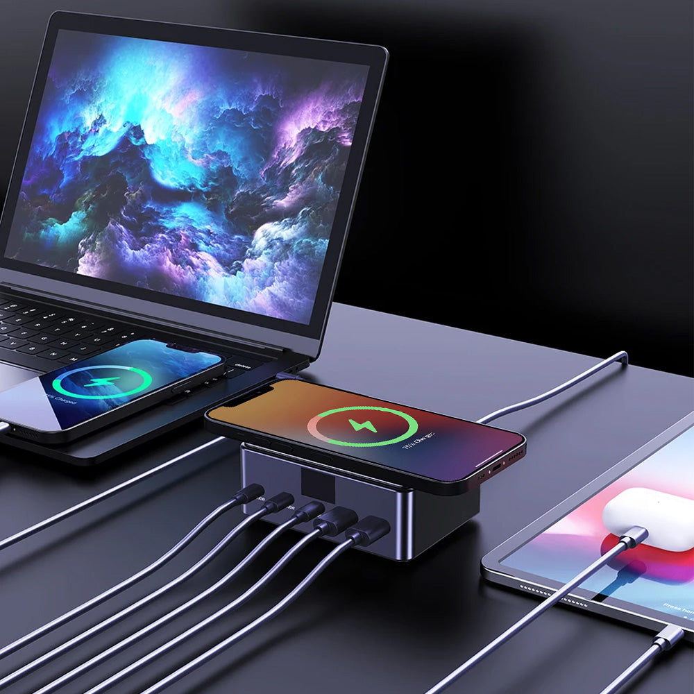 • The 190W Synapse Multi Port MagSafe Charger is your ultimate desktop charging station, designed to power everything at once. With six ports (3x Type-C, 2x USB-A) and wireless capability, it delivers intelligent, high-speed wired and MagSafe-compatible charging to your iPhones, tablets, and laptops simultaneously. Featuring universal compatibility with all major fast-charging protocols (PD3.0, QC3.0, PPS, SCP), it ensures each device gets the optimal power it needs safely. Its advanced PPS management and built-in safeguards eliminate clutter and provide a one-stop solution for all your tech.