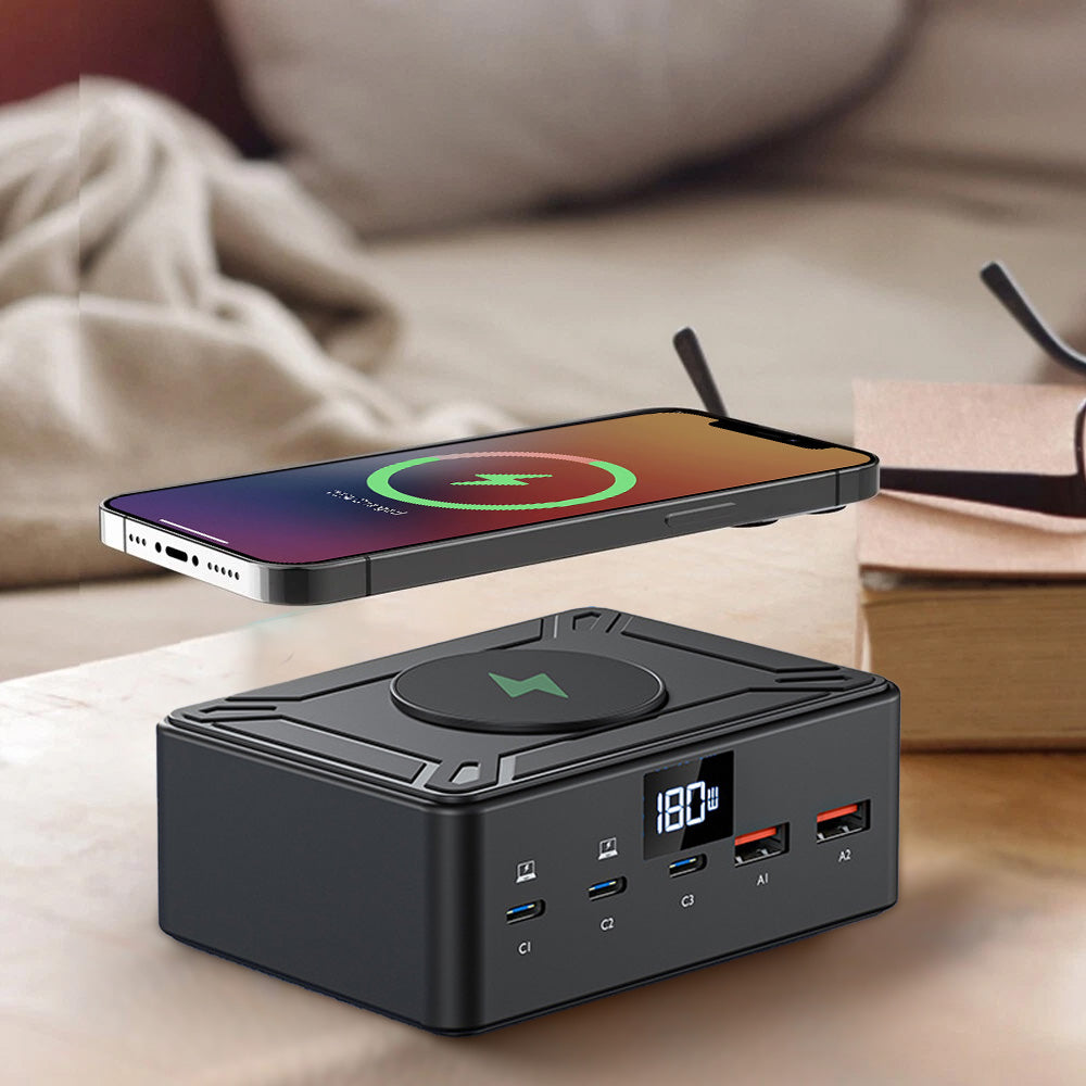 Six ports, wireless charging, and 190W of smart power distribution charge your laptop, tablet, phone, and more all at once without slowing down.