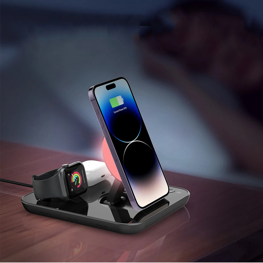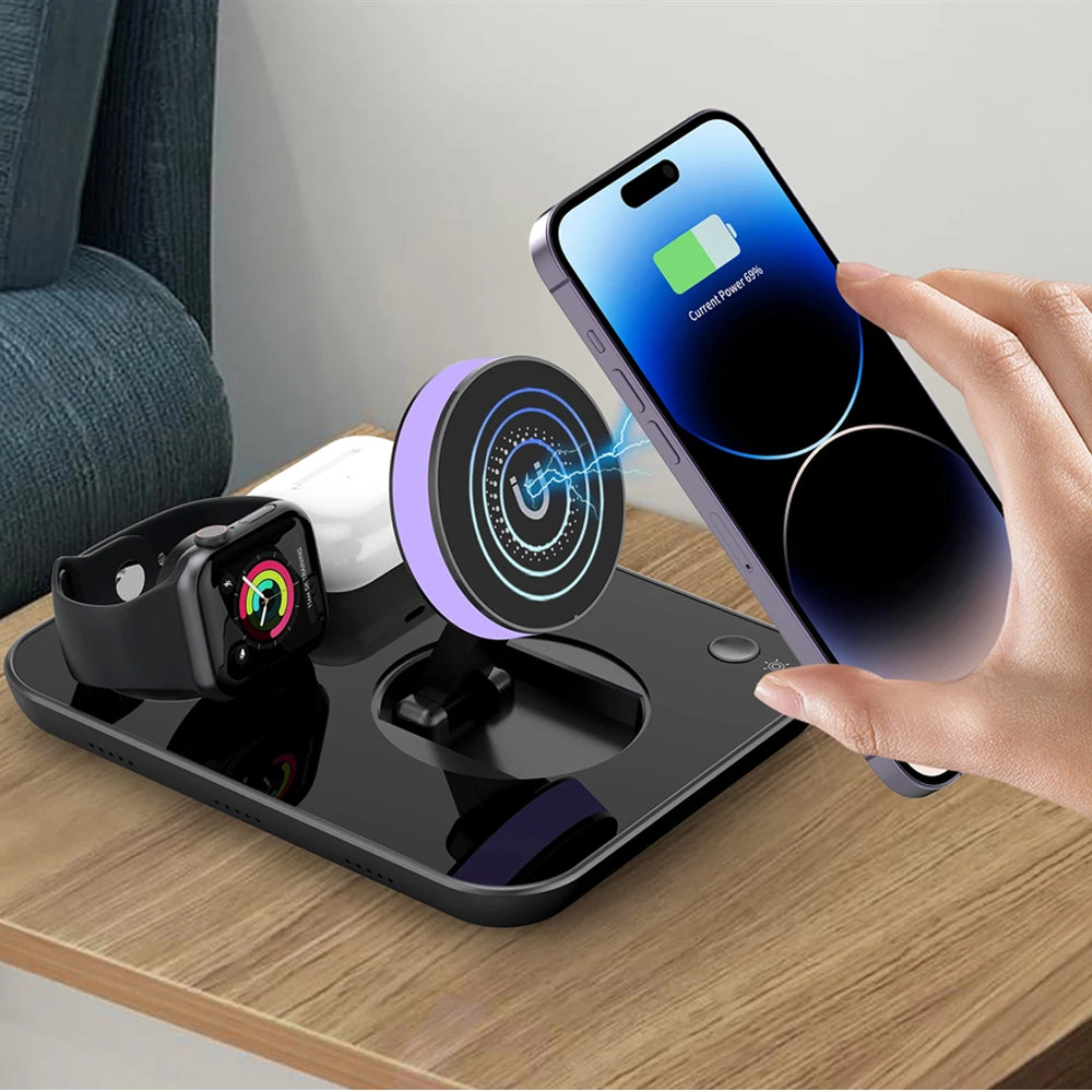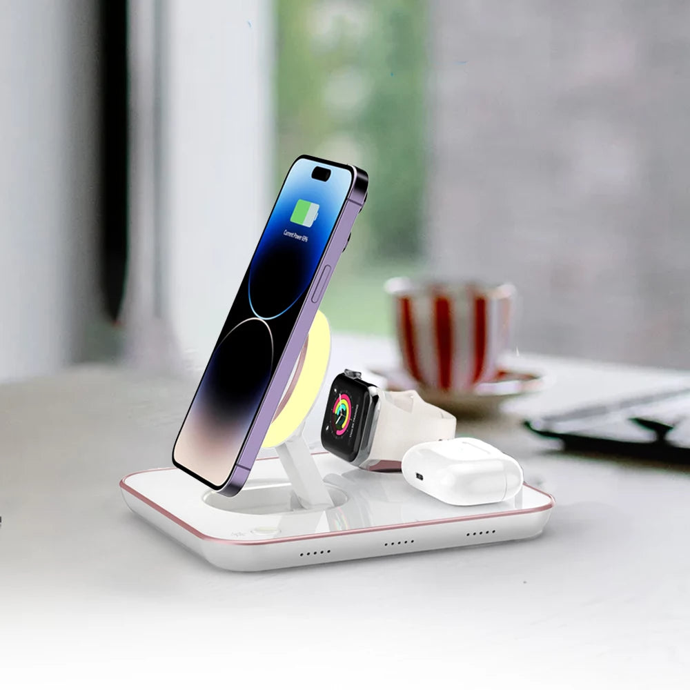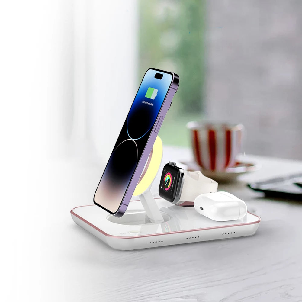 • Discover the pinnacle of charging technology with the LuminHub ArcStation MagSafe 4 in 1 Wireless Charger. Merging the magic of MagSafe with the convenience of multi-device charging, this charger is a must-have for Apple enthusiasts. Not only does it effortlessly power your iPhone, Apple Watch, and AirPods, but you can also you use the AirPods slot for another Qi-compatible device. Its foldable, sleek design is complemented by customizable ambient LED lighting, creating an elegant and mood-enhancing atmosphere in any setting. The LuminHub ArcStation is more than a charger; it's a statement piece that combines functionality with a touch of luminous charm.