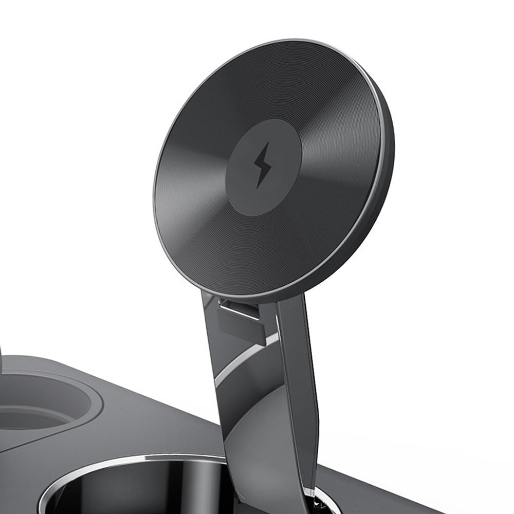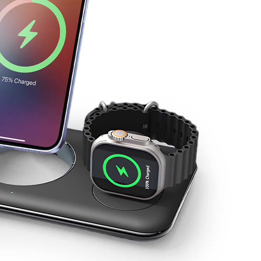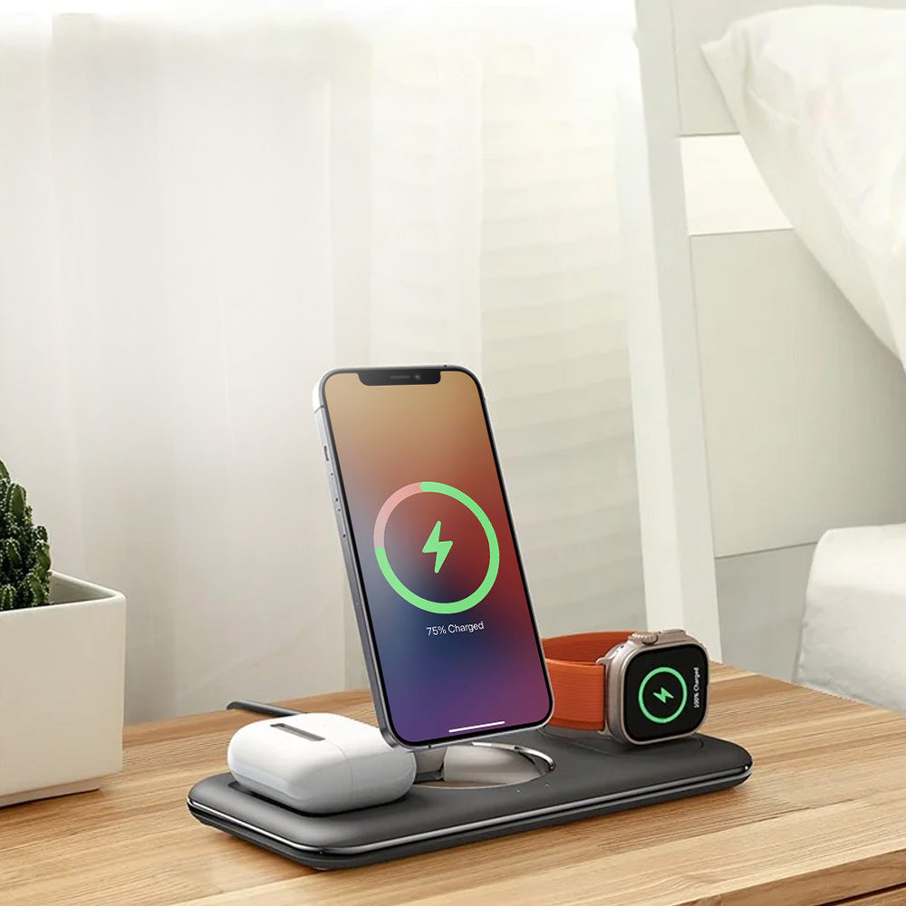 • The NeoDock 3-in-1 MagSafe Charging Pad is a sleek and versatile wireless charging stand designed to charge your iPhone, Apple Watch, and AirPods simultaneously. It supports MagSafe fast charging for iPhones and features a stable design, ensuring your phone stays steady even when you’re using it with one hand. This foldable charging pad is compact and portable, offering both vertical and horizontal charging modes for flexible usage based on your needs. It includes added safety measures such as secure magnetic suction. The Apple Watch charger has a foldable stand, allowing you to charge your watch in different orientations. Additionally, the lightweight and foldable structure makes it easy to store and transport.